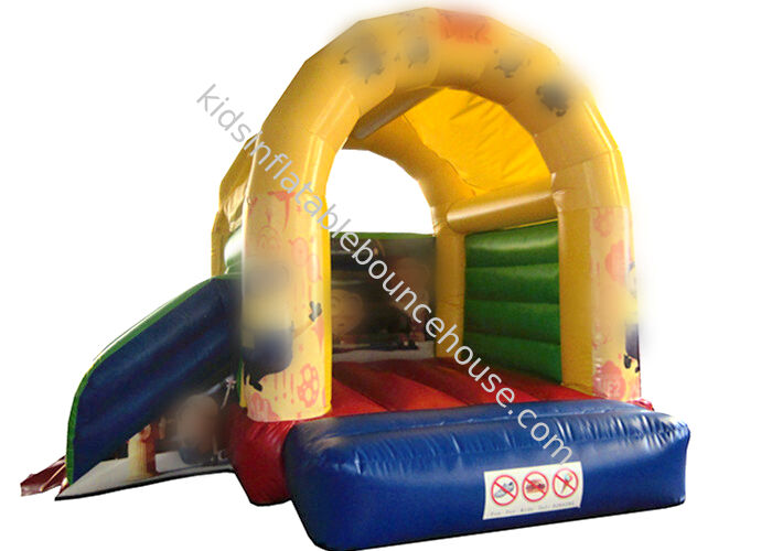 บ้านเป่าลมเชิงพาณิชย์รุ่นนี้มีดีไซน์สีฟ้าและเหลืองสดใสพร้อมสไลเดอร์คู่ เหมาะสำหรับงานปาร์ตี้และงานเฉลิมฉลองของเด็กๆ สร้างขึ้นเพื่อความปลอดภัยและความทนทาน